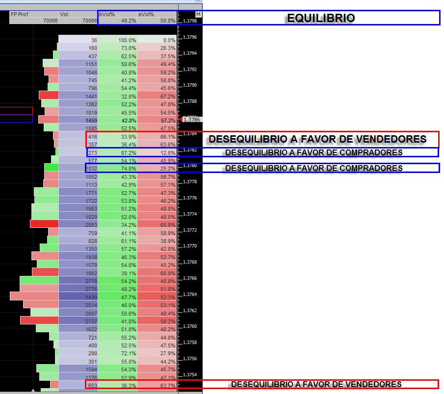 Os pongo un gráfico para observar el equilibrio que comentaba. Es una captura de ahora mismo del futuro del Euro Dólar, como se ve de 70.066 contratos ejecutados hay un 49,2% de compras frente a un 50,8% de ventas, lo que nos da ese equilibrio que comentaba... a lo largo de la mañana, como se puede observar, se producen desequilibrios en ciertos puntos, he marcado algunos, esos desequilibrios son los que hay que estudiar para tratar de saber quién tiene el control del precio.