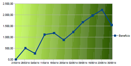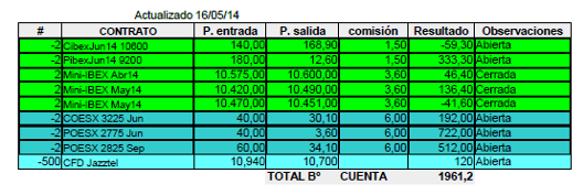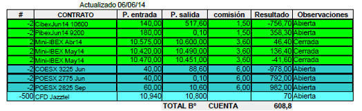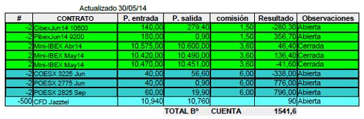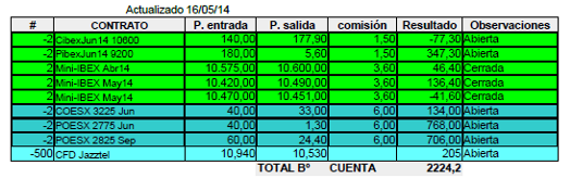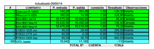 La única operación que he hecho esta semana ha sido el cierre de los dos contratos del Futuro del Mini-Ibex que había comprado el 9-5-14 a 10470, llegó hasta 10665 y terminó a 10451 en el vencimiento del viernes. En esta operación he perdido 38 € más comisiones, pero tuve la tranquilidad de estar cubierto en caso de fuertes subidas.