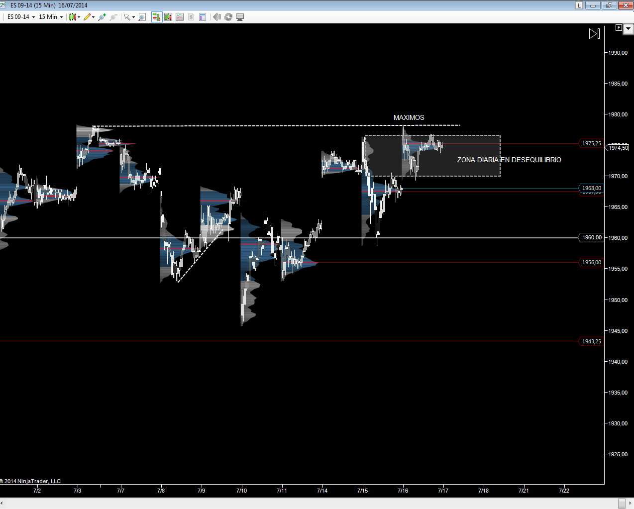 Adjunto en primer lugar las zonas a observar según suelo analizar diariamente. La zona de máximos es importante y como se muestra en el gráfico de hoy han definido ventas en esa área, por tanto interés vendedor. Una zona importante a observar era el área diaria en desequilibrio generada ayer, por tanto de haber hecho algun corto un buen objetivo hubiera podido ser esa zona, (70.25 Elfo... excelente :D ). Con este análisis, es evidente que la consideración a hacer algo debería haber sido en otras zonas y no la propuesta en la foto, pero ya entenderéis porque he pensado en plantearlo.