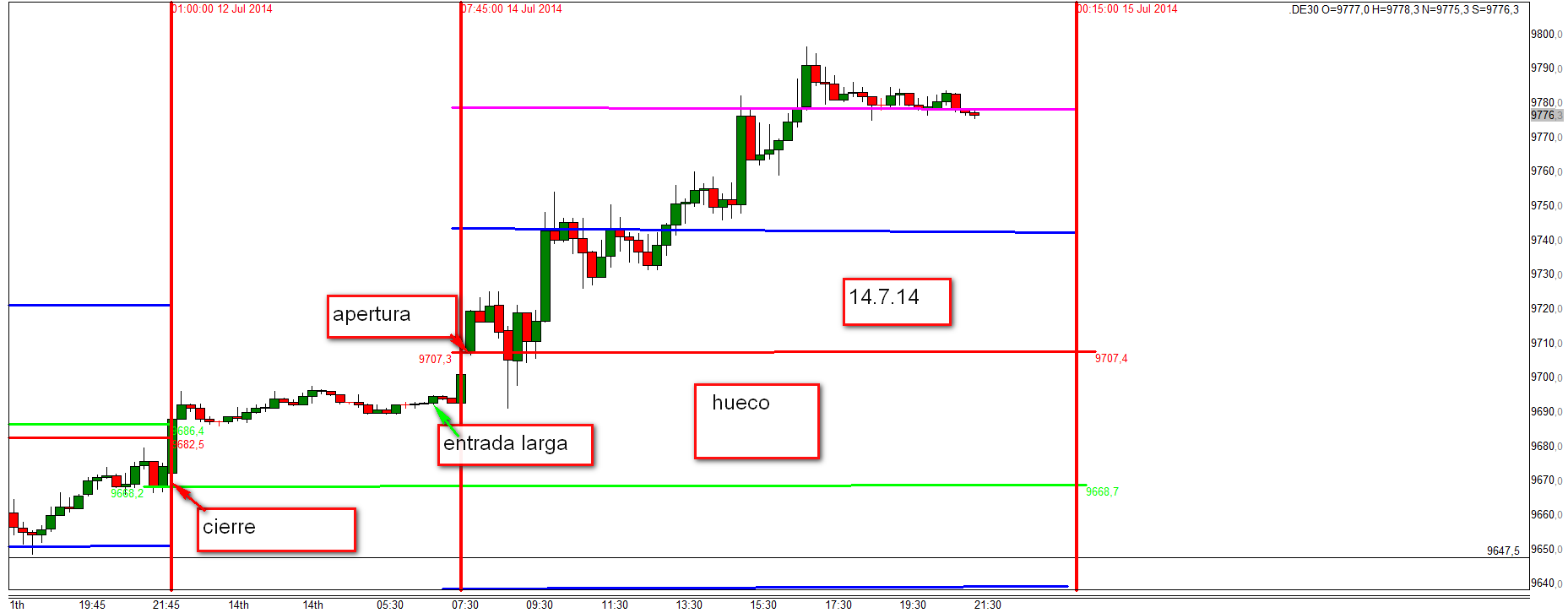 1- Como tú comentas, lo mejor es dejar que se desarrolle el precio para tener más probabilidades de ver la dirección correcta. Las velas de ayer de las 9 y 9:15 (para mí) indicaban que el hueco era de continuación(Regla de toma de posiciones para un Hueco de continuación (“continuation gap”)