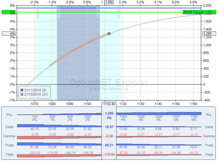 Esto es un mero ejemplo, pero como se puede ver, sólo añadiendo un par de calls conseguimos bajar la vega negativa desde -272 a -183, lo que implica que una subida de 1 punto de IV nos haría perder 183 USD, y no 272 USD.