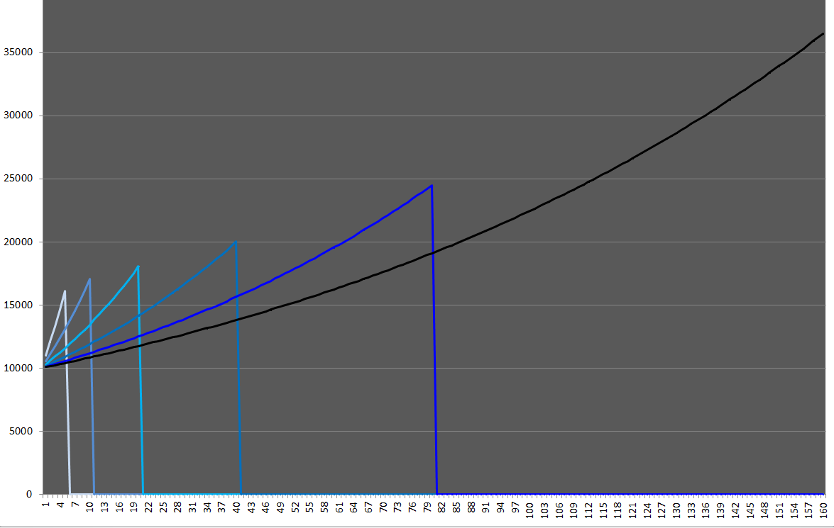 te queda asi doblando los traders para la misma rentabilidad el efecto del interés compuesto.....5,10,20,40,80,160.....