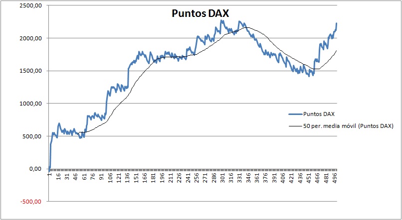 He refinado tanto mis reglas que tengo capacidad de ganar hasta 1000 puntos al mes con el DAX, el problema es que aun me cuesta creérmelas, además de que tengo ciertos miedos y traumas del año pasado. Otro vicio que tuve en Febrero fue el entrar y ver que si no pillaba tendencia, salirme antes de que me saltara el stop...luego al final la posición entraba en beneficios y era buenísima, todo ello también por querer asegurar el mes. El trading no es un mundo para miedosos!