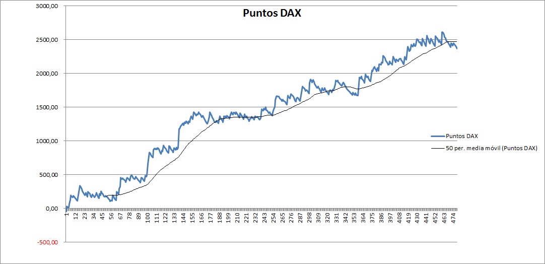 Viendo mis graficos de puntos acabo de ver una manera clara y sencilla para evitar una debacle como la anterior. En este grafico se ven todas mis operaciones, incluidas una fase de, se podría llamar demo, después de la debacle de los 510p que estuve 3 meses mas con 1-2 cfds intentado poner en practica mejoras que había visto y donde tenia como meta recuperar la media móvil que había perdido justo en la debacle.