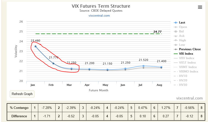 Personalmente no entraría en una posición vendedora neta de opciones con una curva de futuros del Vix como ésta, en pleno backwardation, que el último día además no se relajó un ápice: