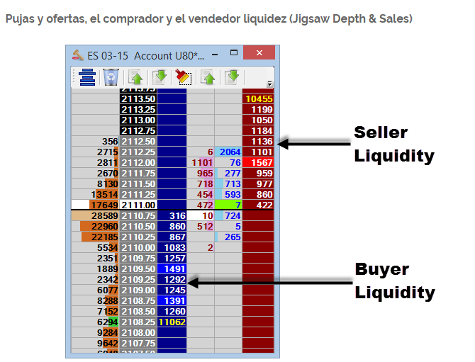 En la imagen superior tenemos un Dome o Depth & Sales mucho más sofisticado y profesional que el de Ninja, el Dome de Jigsawtrading. La profundidad de mercado que podemos ver es de 10 niveles de liquidez. En la columna de la izquierda hay un Perfil de Mercado (Market Profile) donde vemos los precios más negociados. La siguiente columna es el precio. A continuación en azul vemos la profundidad de mercado de las ofertas que hemos explicado anteriormente en azul. Su contrapartida en rojo en la última columna. Y las dos siguientes columnas son el número de órdenes de mercado de compra en azul y de venta en rojo.