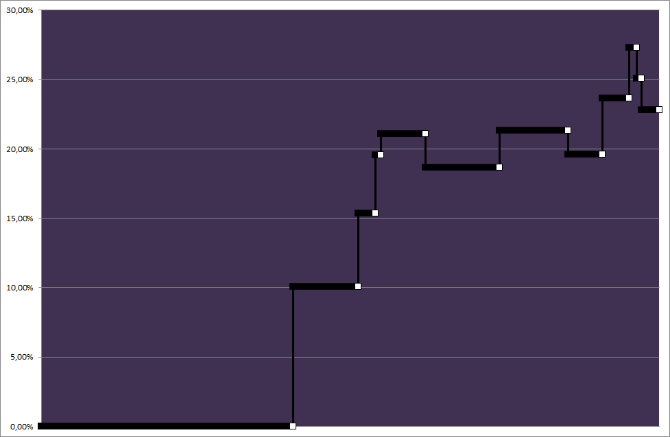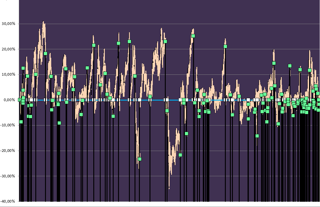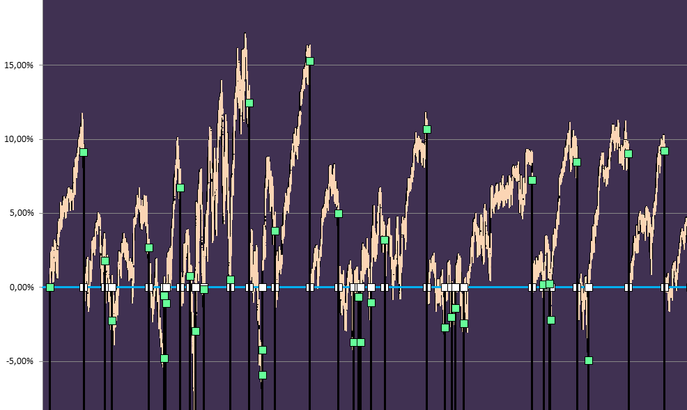 Pongo una visual, donde los cuadraditos verdes significan fin de escenario o señal (porque aparece otra señal), la cotización en rentabilidad esta en color crema, los cuadraditos blancos es el principio de la nueva señal, y la línea azul es la horizontal a la rentabilidad 0% de comienzo de la señal.