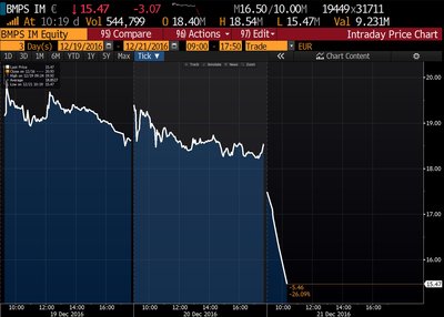 Atentos porque la cosa se pone calentita: Banca Monte dei Paschi acaba de anunciar que le queda como mucho liquidez para 4 meses. De momento las acciones llevan una caída de casi el 20% y ahora mismo están suspendidas en la Bolsa de Milán: