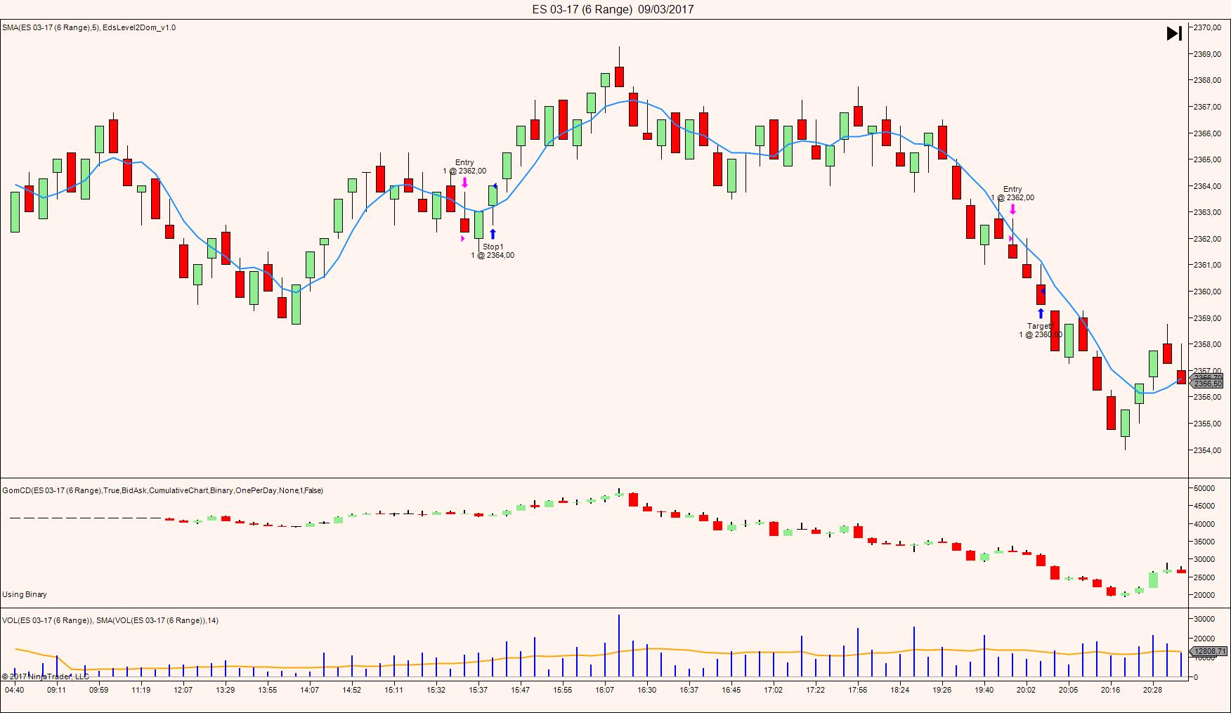 La tendencia de fondo en el ES es bajista, y me gusta probar a favor de tendencia. Poco antes de la apertura (15:30) el precio estaba empezando hacer mínimos decrecientes. Tras la apertura observé una absorción de largos por parte de vendedores pasivos. Realmente pensé que íbamos a visitar mínimos de sesión. Entré corto en 2362,00 y me sacaron en 2364,00