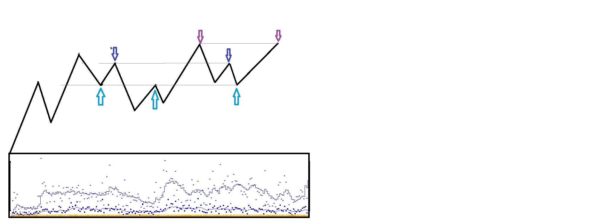 Calculas por un lado los impulsos alcistas (los rectángulos verdes que has pintado) y la delta empleada en ellos. Y lo mismo para los bajistas. Y sacas algún ratio combinado para decidir.