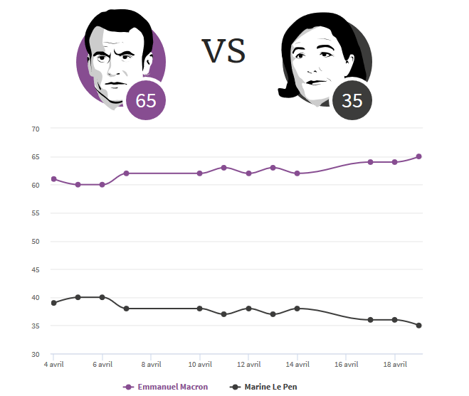 Sobre los sondeos, aquí tenéis un gráfico actualizado con la tendencia de los diferentes candidatos. Como podéis ver, el tema está muy reñido entre Macron, Fillon y LePen