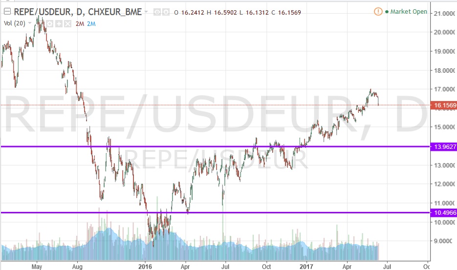 En la imagem tenemos a candels REPSOL en Dollars e en la linea roja el crudo