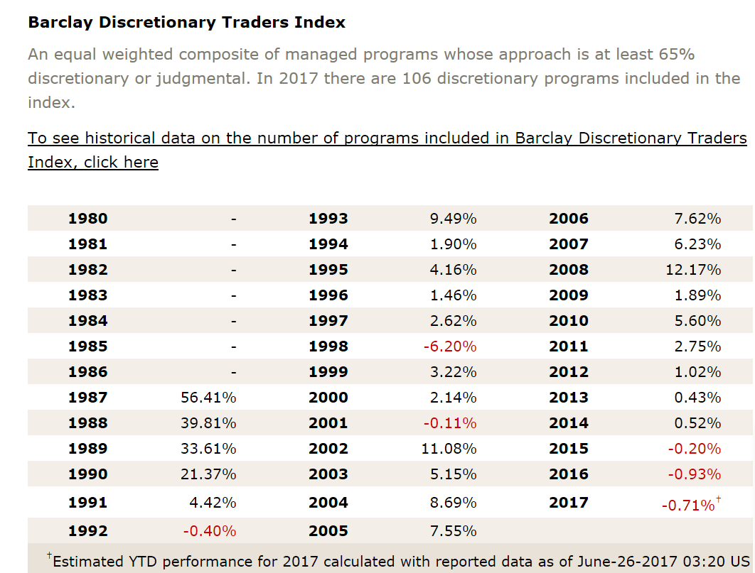 Los discrecionales no lo están haciendo mucho mejor, son unos 105 programas discrecionales en el baclays index, y unos 409 sistemáticos.