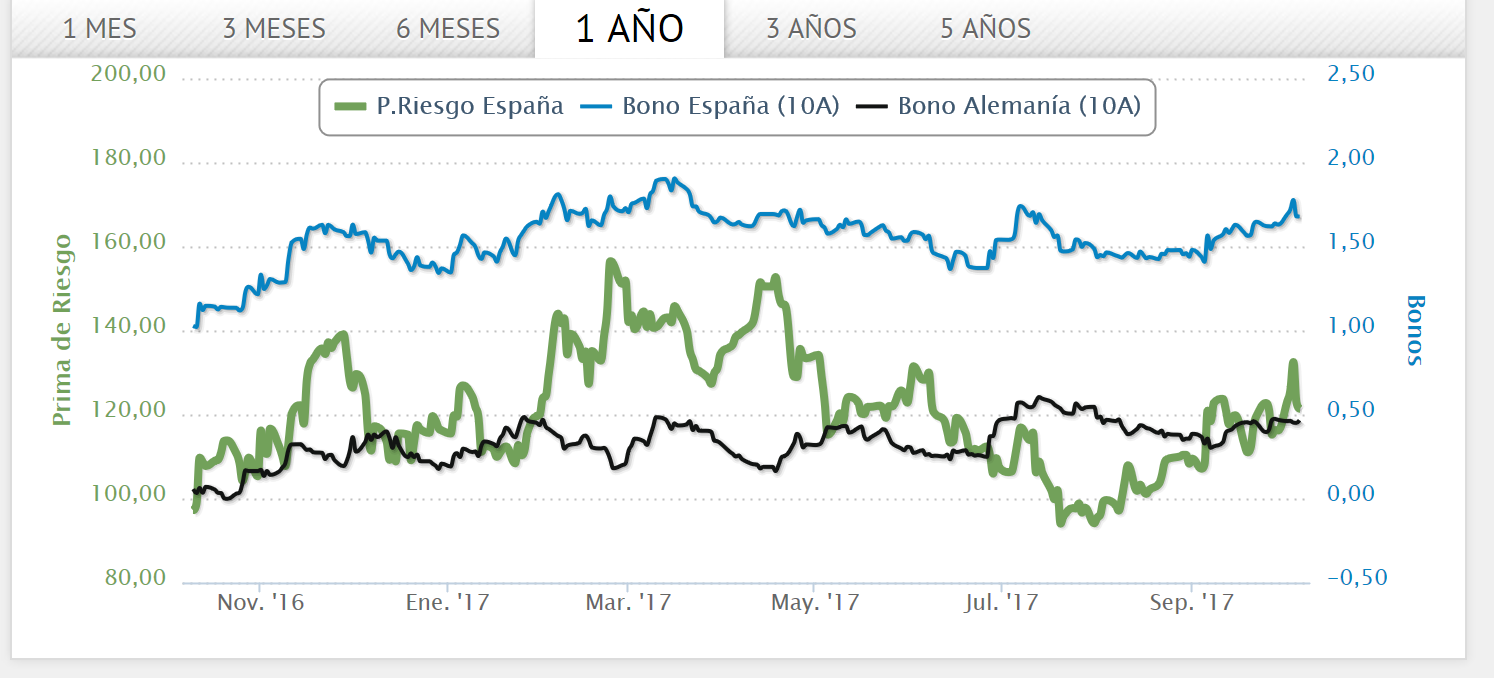 Aunque tenemos un dato interesante y es que la prima de riesgo de España ha subido un 6,87% desde el proceso independentista, no es alarmante pero si es volatilidad de incertidumbre, si estuviéramos en un momento de independencia real, tendrías que irte al gráfico de hace 5 años a ver si rompe o no .....