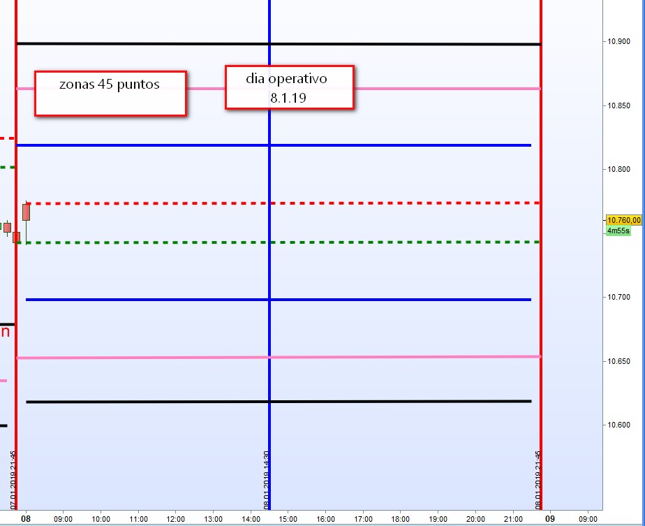 " Las zonas de actuación son a veces atravesadas dinámicamente, mientras que en otras ocasiones la cotización se gira exactamente sobre ellas. También puede ocurrir que el precio se gire uno o dos puntos antes de la zona. Un trader experimentado puede por ejemplo, después de recibir el aviso de la alarma antes definida, mantener una orden límite en espera para adaptarse a esta casuística."