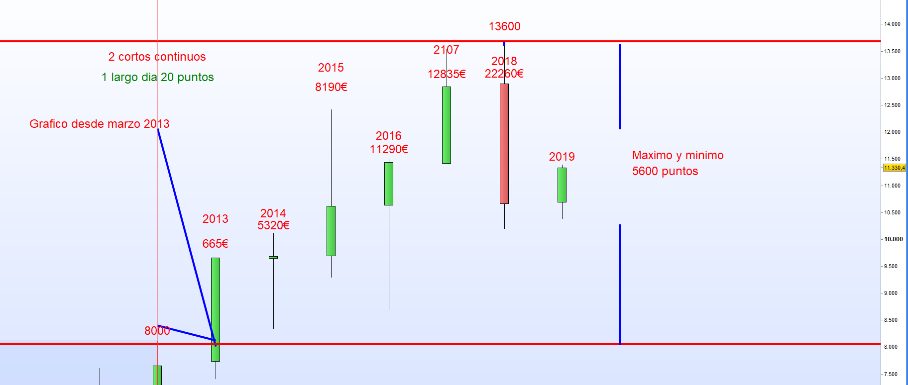 a 13600 maximo = una diferencia de 5600 puntos.La idea es de tradear 1 solo largo contra 2 cortos y ganar por medio 20 puntos/dia. Los resultados son a simple vista modestos y aunque de 2013 hasta 2917 el precio ha subido 5600 puntos cada ano ha sido positivo culminando 2108 en un benefico de 22.260€ teniendo en cuenta los intereses para los 2 cortos a 0,75€ o 1,5€ dia calendario. Contamos con 250 dias de trading por ano.