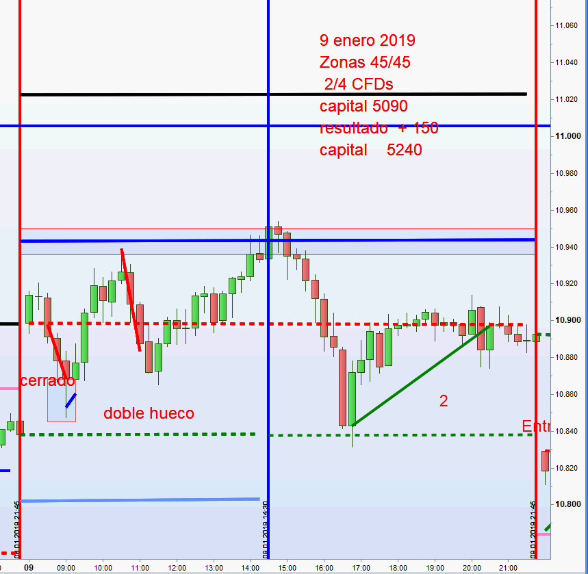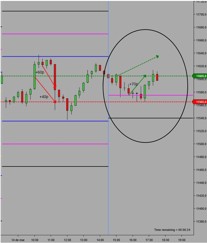 4.- Veo que se ha dejado la operación de la primera zona abierta antes de las 14,30 para llegar al close del cierre de ayer . Con lo que en este punto no ha sobrepasado ni la linea close de ayer, sólo la ha tocado. Y este hecho lo consideramos como correcto para ejecucción del setup de cruce ya que posteriormente el precio baja y consideramos apertura de posición en segunda zona. Es decir, estamos mezclando dos cosas, una operación abierta antes de las 14,30 con objetivo el close y otra es el setup de cruce claro de la linea de close de ayer.