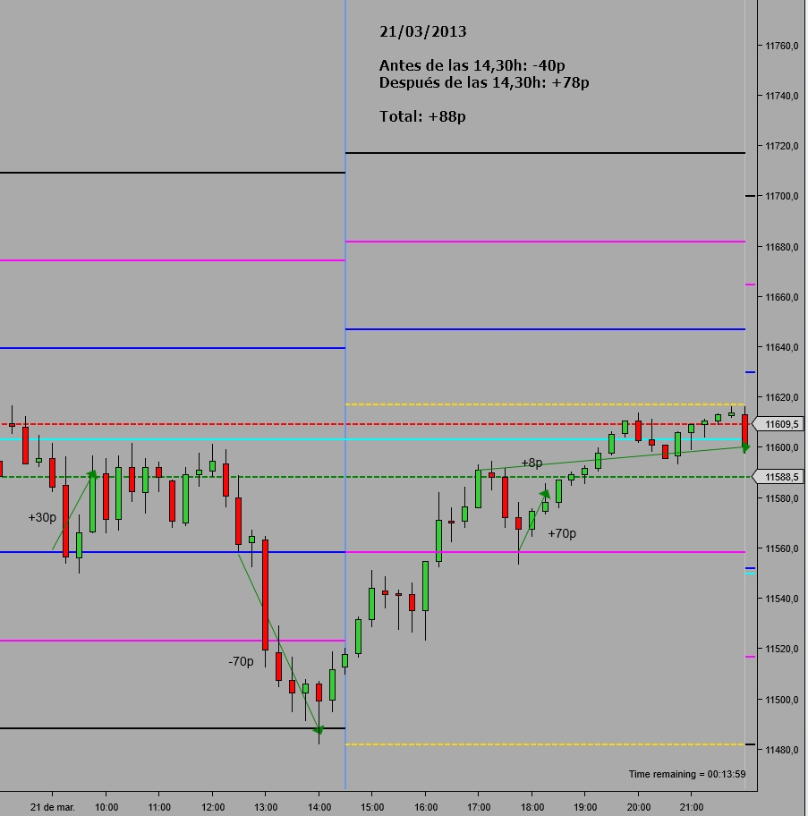 PD2: Muchas veces se ha comentado que la parte más básica del sistema (es operar hasta las 14,30h (George nos comentó que proporciona el 70% de los beneficios totales) ya que operar por la tarde implica profundos conocimientos y observar la correlación con el DJIA-FUT.