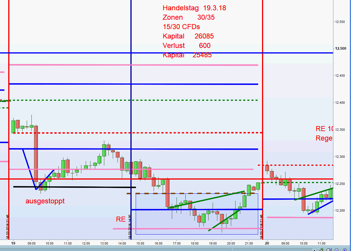 3. Wurden beide Zonen sichtbar durchgehandelt erfolt ein Einstieg auch erst nach einer Umkehrkerze und der Chart wird neu gezeichnet.