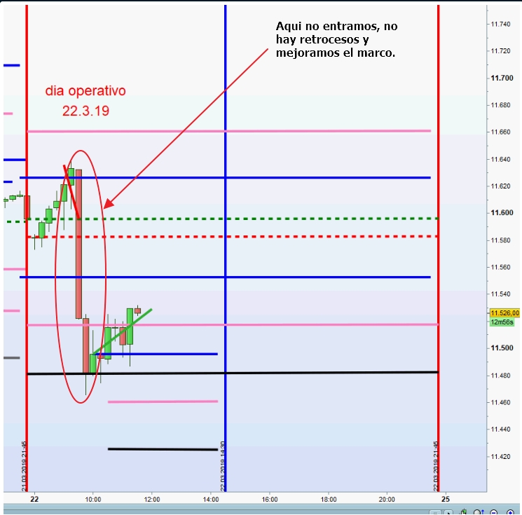 juancv escribió: 21 Mar 2019 23:14 Una cuestión, entonces ¿porque el día 14 no se operó ese cruce de la linea de close de ayer? Es que no veo criterio objetivo. Como tampoco entiendo el setup ejecutado el día 9/01/2019 durante la tarde, ya que en tiempo real ese trade probablemente no se hubiera operado ya que no sabemos lo que va hacer el precio y viendo la tendencia bajista sin retrocesos que le predecía antes de tocar la linea de close del día anterior dudo que alguien se ponga largos en ese punto al no cerrar la vela bajista por debajo. Además de que en la imagen que adjuntas entras en el open de la vela alcista después del toque, no esperamos ni a confirmar que el precio cierre por encima de la linea close del día anterior para entrar. Nos has comentado en algunas ocasiones que debemos tener una confirmación del precio para entrar. Adjunto foto del setup.