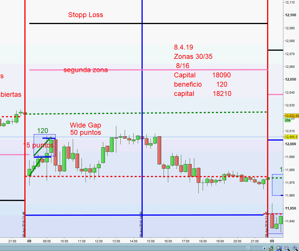 Adjunto los graficos de los 5 ultimos dias operativos. No hubo ningun dia de perdida con un beneficio de 1360€. El capital actual son 19450€ y por el momento seguimos la operativa con 8 y16 CFDs.