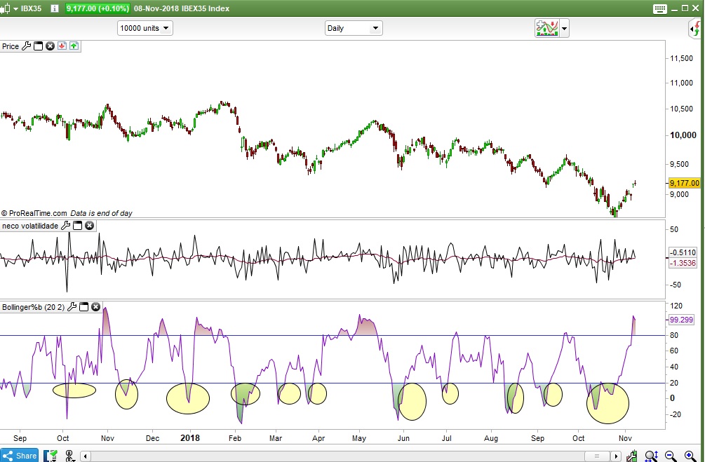 Las bandas de bollinger solamente sirven para saber si la volatilidad se salto de su historico passadoHermess escribió: 10 Nov 2018 18:56 Si metemos una media corta de 20 días en bollinger nos marcara las pequeñas oscilaciones de ese nº de velas, para acciones ese indicador que muestras llega muy rápido a sobrecompra o sobreventa porque la media que usas es muy corta, no es una estrategia tendencial, es de oscilación con reversión a la media contratendencia en este caso.