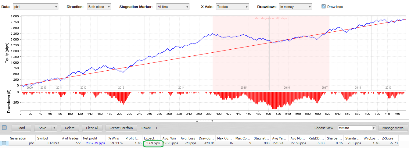 ¿que consideraciones adicionales tomarian en cuenta? --> Dentro de las optimizaciones buenas intentaria buscar una que de un Expectancy lo mayor posible. Quiero decir, la estrategia me parece que esta bien, puede ser aceptable y seguro que hay muchas optimizaciones con buenos resultados, pero elegiria una con un Expected Payoff lo mayor posible para que "resista" un mayor slippage e imprevistos