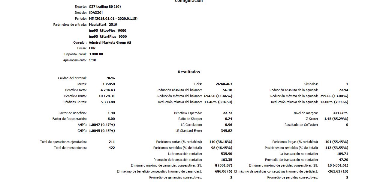 el trailing lo hago mal, creo que calcula 80 puntos desde apertura, en lugar de 80 de beneficio, rectificando esto ya paso a mas del 40% de ganadoras, aunque el resultado empeore (lo tengo que ajustar y lo paso), a lo mejor es una idea para otro robot de falsas roturas :lol: