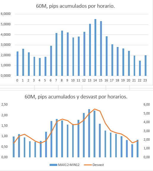 Después calculo la desviación en función de los horarios. Calculo también la diferencia entre máximos y mínimos en barras de 60M. Encuentro que las mejores horas son las de la apertura de Londres y en especial las del mercado americano: