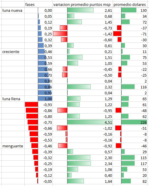 Sobre la pauta de fase lunar aplicada a los mercados, el problema es como analizarlo. La fase lunar es cada 29,5 días, pero no exactos. Lo correcto es tomar excel y manualmente marcar las fechas en que se tenia luna llena, algo bastante aburrido. Después ya aproximar las diferentes fases y calcular variación promedio.