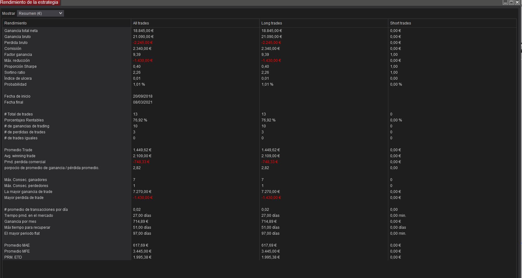 Hola Gibranes, revisando el pantallazo que has subido lo primero que me ha llamado la atención es que tan solo hay 13 operaciones por lo que las conclusiones que puedes extraer de las estadísticas son poco menos que inútiles. ¿Puedes aplicar la estrategia a un histórico más amplio para poder valorarlo?