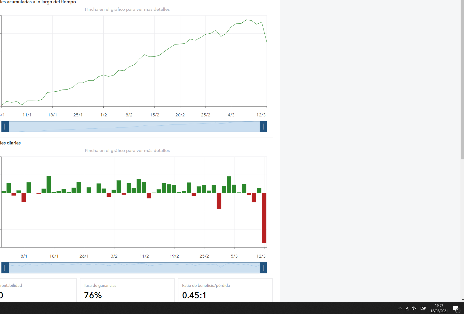 X-Trader escribió: 12 Mar 2021 17:42 ¡Ufff cuidado con eso dahon! No debes consentir nunca que tu pérdida media sea casi 10 veces tu ganancia media, ahora toca corregir eso poco a poco y lo malo es que no te deja mucho margen para errores. ¡Mucha suerte!