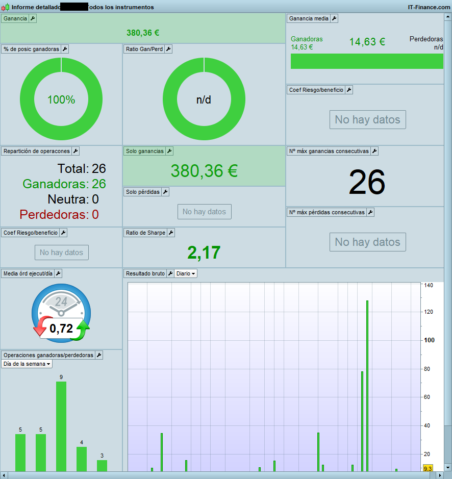 En cuanto a lo otro, esa es la cuenta de juguete.. donde hacia pruebas. Ahora reconvertida en afianzadora de tesis...mi record personal en trades seguidos ganadores en futuros esta en 28 trades, asi que aun hay margen para que tire un poco mas.. pero vamos que ya caera .. que esto es asi. Y no se trata de ganar siempre, sino en las condiciones en las que se gana.