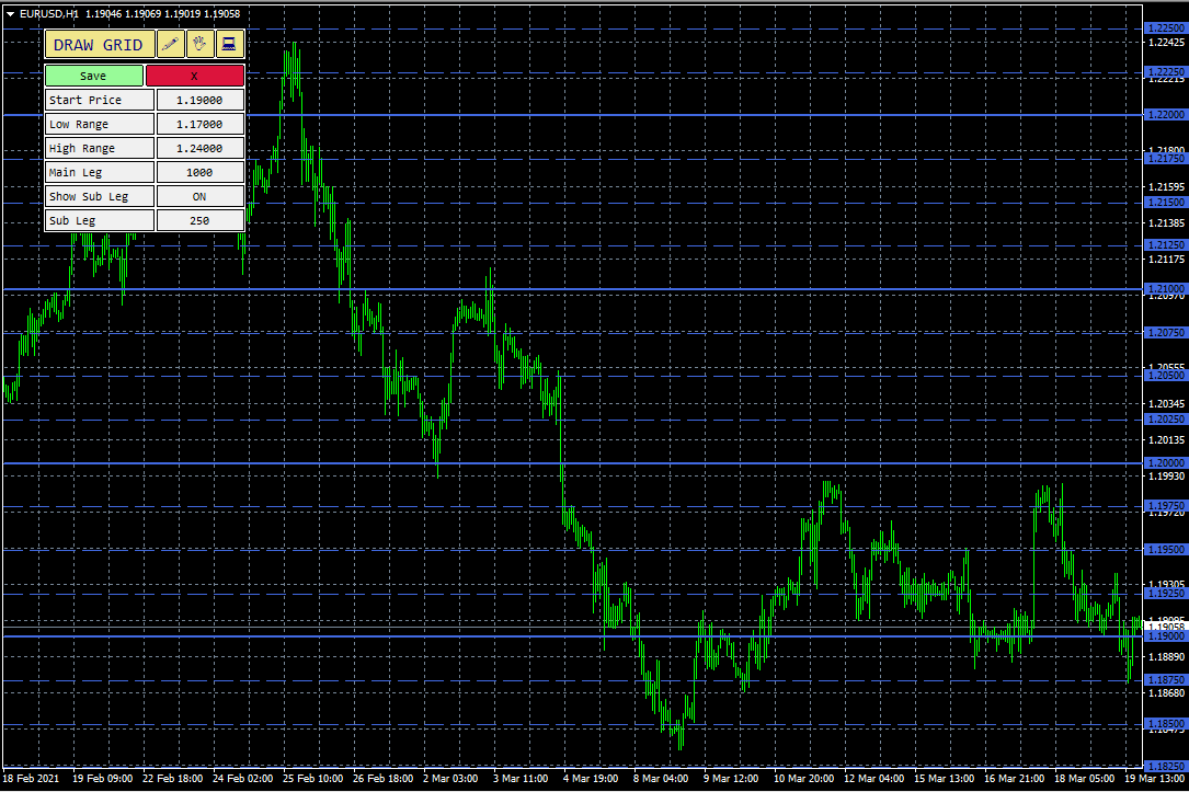 Por su parte, el segundo (MQLTA MT4 Draw Grid) es algo más complejo (tiene varias carpetas que debéis copiar dentro de vuestra carpeta MQL4 de vuestro Metatrader) y te permite afinar mucho más la posición del grid (puedes elegir puntos de inicio y final, subdivisiones, espaciado, etc.)