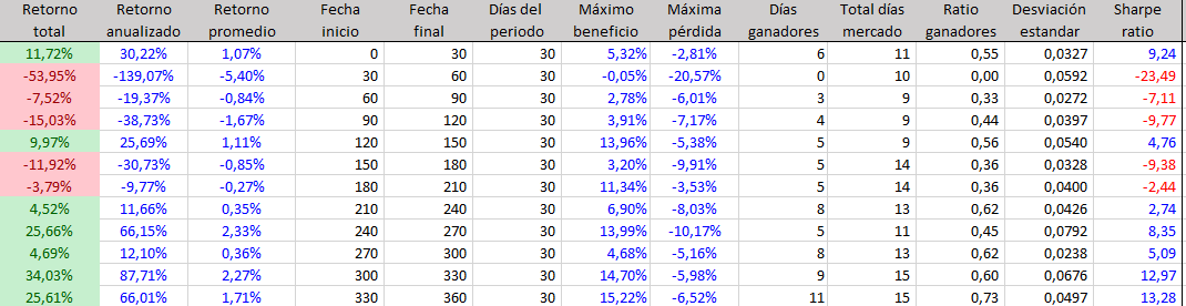 En el gráfico que subo se aprecia que los rendimientos positivos concuerdan con los ciclos estacionales del mercado. El cual suele subir de diciembre a mayo. Si los hubieran respetado se habrían evitado las pérdidas aparentemente ocasionadas por las transformadas de Hilbert. No todo es Fourier, no todo es Hilbert y no todo son series estacionales.