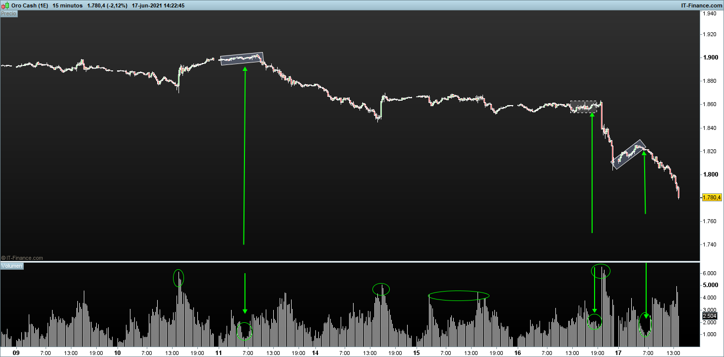 En esa pauta que colgué antes del oro, si lo llevamos a 15m, podemos comprobar que justo antes de iniciar un movimiento con persistencia direccional, el volumen se seca, no hay interes en continuar en esa direccion
