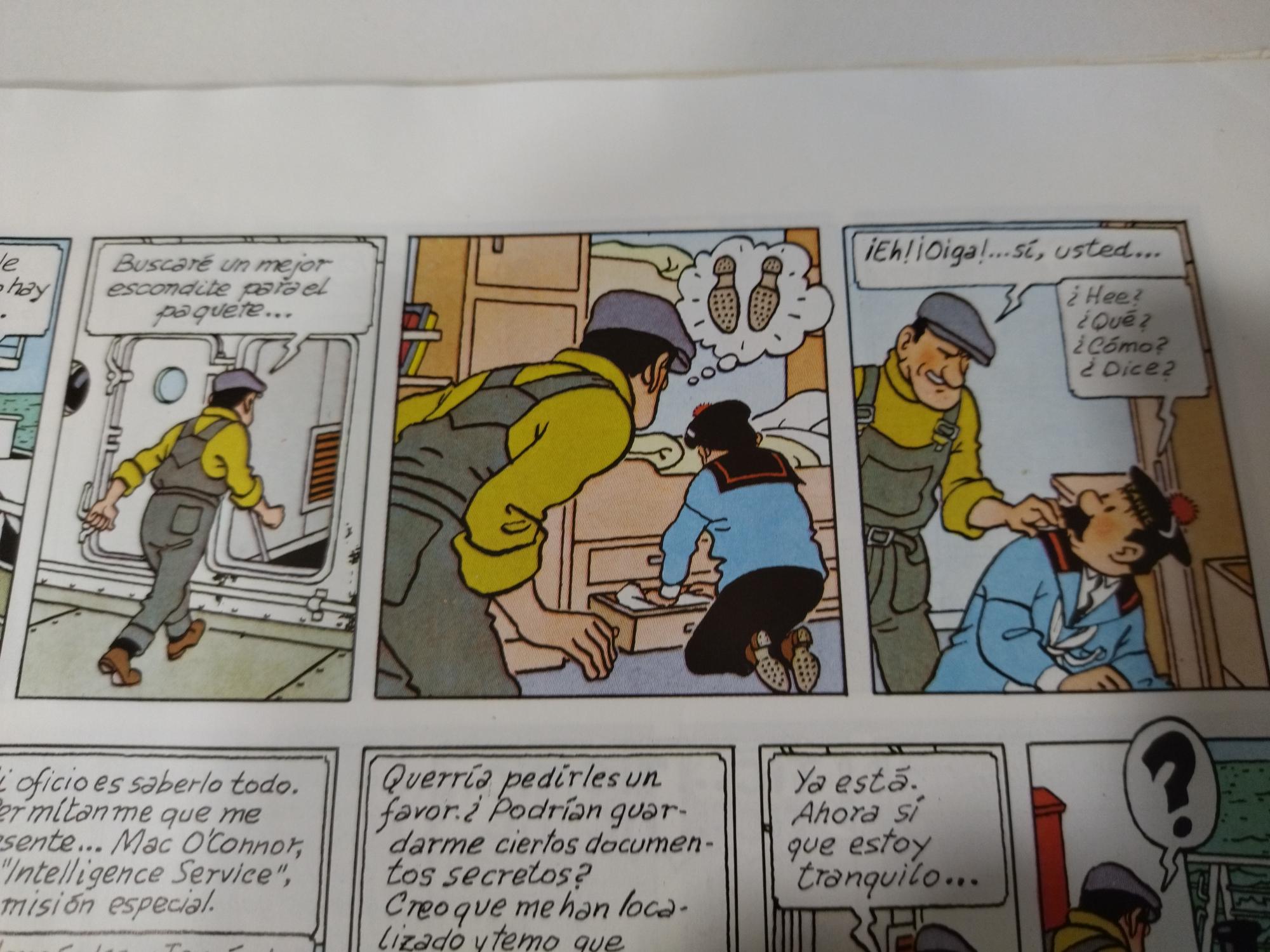 Como no puedo añadir nada más, y aunque quizá no venga a cuento pero me ha parecido divertido porque me ha venido a la cabeza, os cuento que en el libro de Tintín en el país del oro negro, detectan a los policías por la suela de los zapatos con clavos que llevan, que son curiosamente como los que mencionas en tu aventura. No sé si habrá alguna conexión también, je, je. Adjunto fotografía.