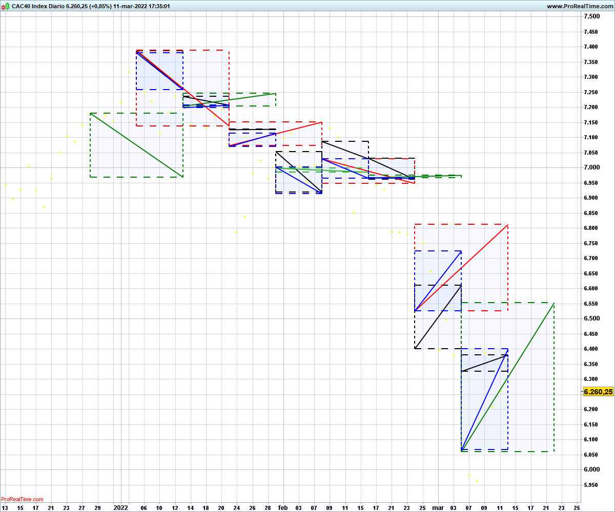 ¿Como hago estos gráficos?, pues por involución,empece en La Bolsa de Joramón,¿que es esto?, no me suena de nada, dira alguno, lo comprendo es que casi no existian los ordenadores,mi Dios era José Ant.Fernández Hodar, la verdad es que no habia otro,luego me pasé a D.Antonio Saez del Castillo(tratarlo de Don es indispensable para el) y los otros eramos llamados por el mismo sus alumnos o sus díscipulos,(vamos que nos ponia un escalón por debajo de el), tambien estudié mucho tiempo haciendo experimentos con todos los artículos de este foro,artículos dedicados a cosas que ya no se usan,Di Napoli, Geometría de Drummond..........,y especializarme en gráficos diarios hechos a mano, sin ordenador, como los hacia Goichi Hosoda, por eso digo que hago estos gráficos por involución,simplemente los cuadros negros del gráfico son el precio de cierre en gráfico diario,prescindo de los precios de apertura,mínimos y máximos que tanto le gustaban a Wilder,(otro antiguo),lo demás los rectangulos los dibujo a mano con mucho trabajo y paciencia relacionandolos con los cuadros negros del precio de cierre según donde se encuentren.