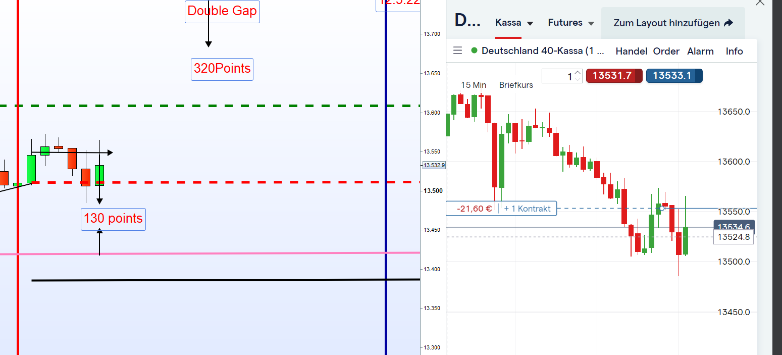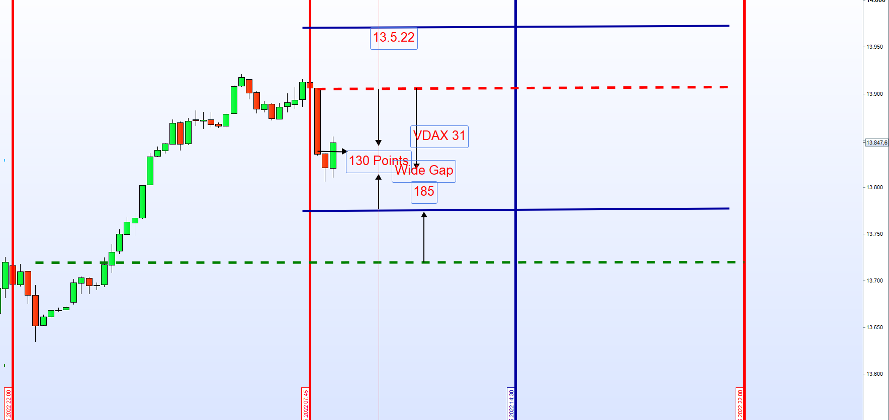 "Weiterhin ist aufgrund der erhöhten Notierungen von DAX und DOW zu beobachten, dass bei einer Notierung diese Indizes von minus 0,5% + morgens um 8;00h mit stark fallenden Kursen zu rechnen ist".