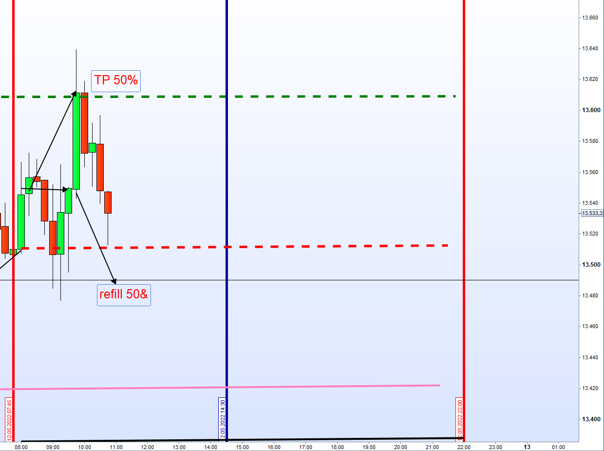 La estrategia aclara que es para situaciones en las que los índices cotizan por debajo del 0.5% y mi duda es si deberíamos interpretar que también puede ser aplicada para momentos en los que los índices cotizan por encima del 0.5%. Este punto podría ser interesante para aplicar a la operativa de hoy 13/05/22 08:00 en el caso que a las 8:00, los futuros del DOW cotizasen por encima del 0.5%