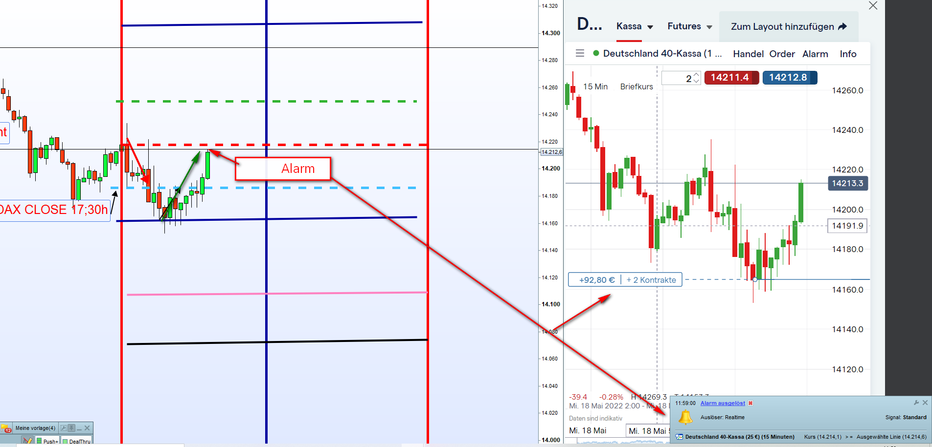 Si el precio en la apertura a las 8:00 a.m. está 100 puntos por encima del precio de cierre del DAX del día anterior y el DOW FUT (DJIA FUT) sube más del 0,5 %, se prefiere una posición larga. Sin embargo, se recomienda observar primero el precio de apertura a las 9:00 horas y la evolución posterior del DJIA FUT.