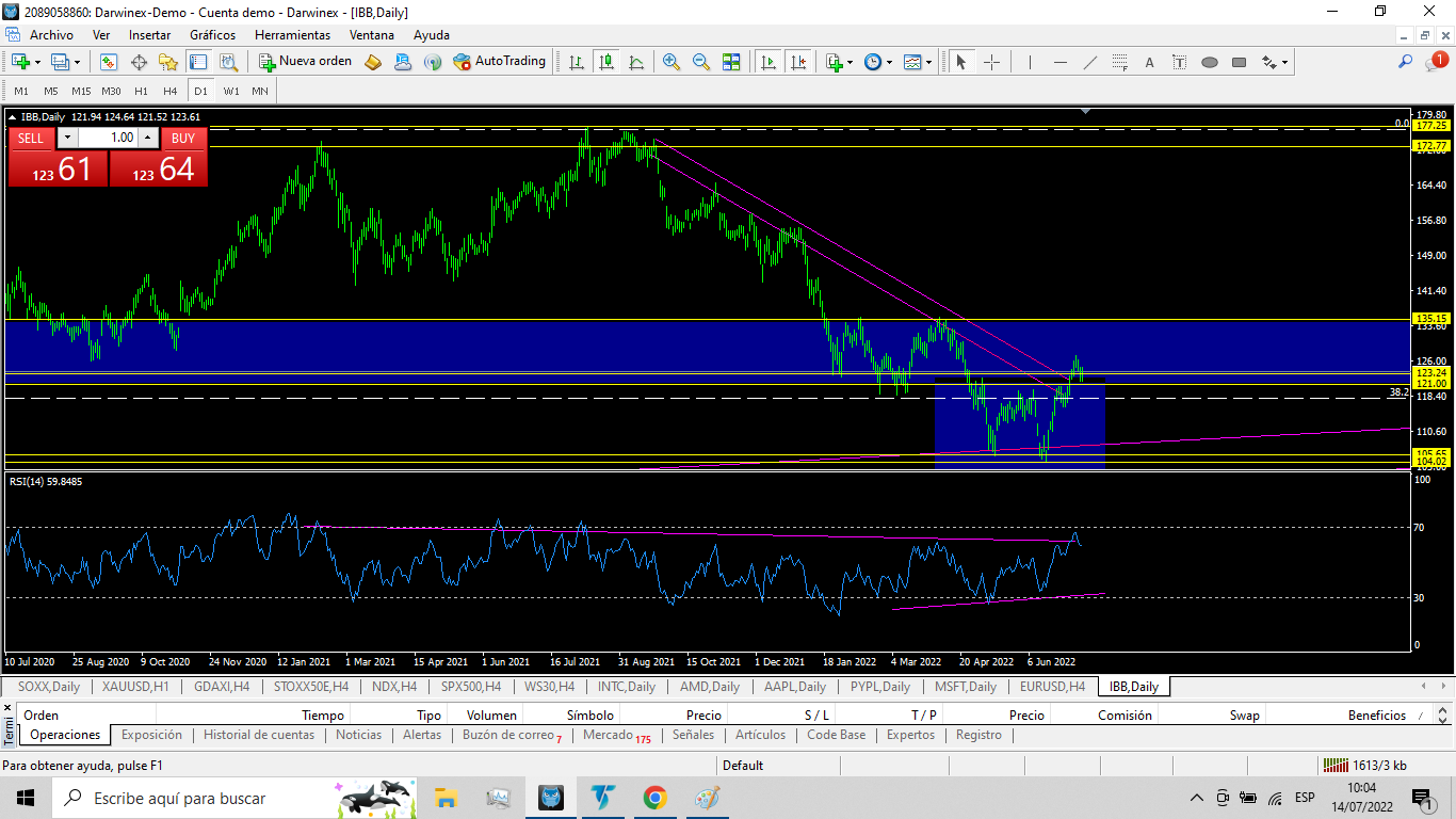 Buenos días, cansado de tanto mercado bajista, hay un etf, el de biotecnología, que tiene formación de vuelta, esto es lo que me gustaría ver en los índices, un doble suelo, corrección del 0,50 de fibo de toda la estructura alcista.
