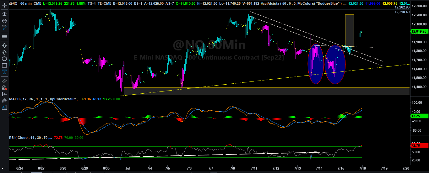Buenos días, el viernes me fui a la cama con una sensación rara, de que algo no estaba saliendo según lo planeado. Si bajamos a gráfico de 60 minutos en el sp y nq observamos un HCH invertido y un doble suelo, en el caso del sp le da justo para sacarme de los cortos; en los timeframe más bajos las figuras suelen fallar más pues están sujetas a una mayor sensibilidad a las noticias pero esta tiene pinta de que si va llegar a objetivo.