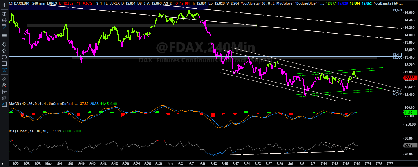 Buenos días, subo el gráfico del dax, donde se aprecia que sigue dentro de un canal bajista de corto plazo y en su último movimiento no llega a la base frenándose en un soporte relativamente importante en la zona de 12380-12450. ¿Qué podemos esperar? el rsi rompe la directriz al alza pero lo tiene que confirmar el precio, en la zona 13020-13050 tiene una resistencia que si la rompe podría ser una formación de doble suelo.