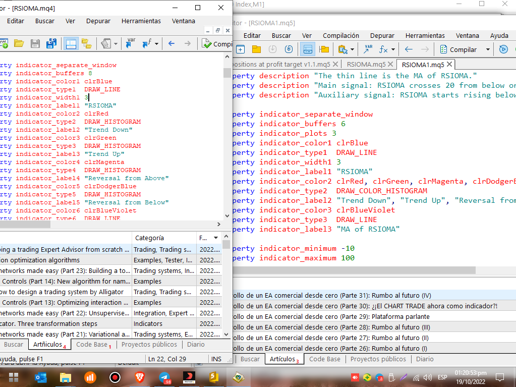 Agradezco la disposición... estuve intentando copiar los codigos y llevarlo a MQ4 pero encuentro que hay uno que tiene 6 y el otro 8.... al intentar compilar me salen errores. Solo deseo que al cruce realice alerta al momento del cruce igual que el que editó sfriendsm2...Foréxitos escribió: 19 Oct 2022 15:41 Hola Sannti, si necesitas modificar el código del RSIOMA.mq4 yo te ayudo sin fines de lucro. Probalo, miralo bien y después decime que te gustaría que haga el indicador (aparte de que tire alerta en el cruce). Saludos.