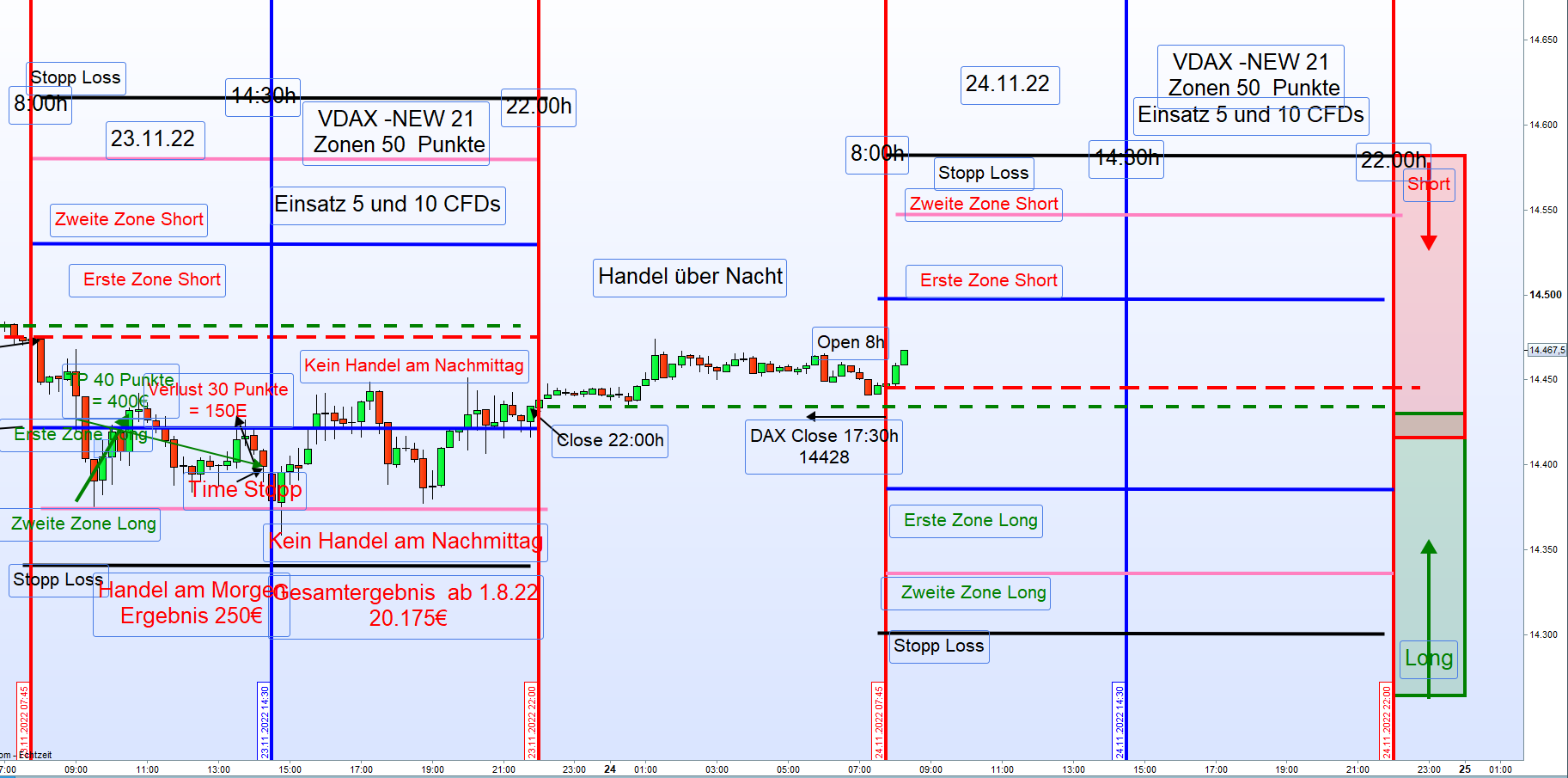 Para una volatilidad 20-25, Georg en su marco operacional fija una distancia de 50 puntos a partir del la apertura o cierre, si tenemos en cuenta las segundas zonas, estaríamos en 100 puntos a cada lado, además habría que sumarle el GAP que se produce entre el cierre del FDAX 22:00 y la apertura del FDAX de día siguiente a las 08:00, por tanto no es tan descabellado pensar en algo parecido a esos 222 puntos para que se produzca una reversión. De todas formas, no hay que centrarse tampoco en los 222 puntos, pues estamos hablando de la media y esto sólo recoge el 50% de los casos. Hay que ser un poco más pretencioso y tomar la media + la desviación típica, es decir 329 puntos de rango total, en este caso seremos más ambiciosos en la selección de trades (menos entradas), pero con mayores posibilidades de éxito al englobar el 70% de los casos.