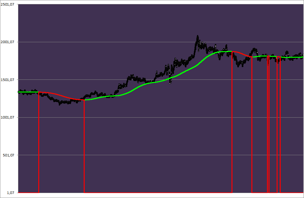 Cuando las medias de los dos timeframes estan alineadas abre operacion larga, es un metodo que se lleva utilizando hace mucho tiempo y por si mismo sin mas filtros tengo dudas de que tenga ventaja significativa porque las tendencias robustas tienen base fundamental, si obviamos esto nos quedaria una estrategia tecnica