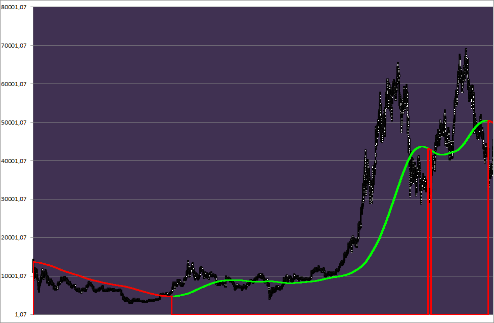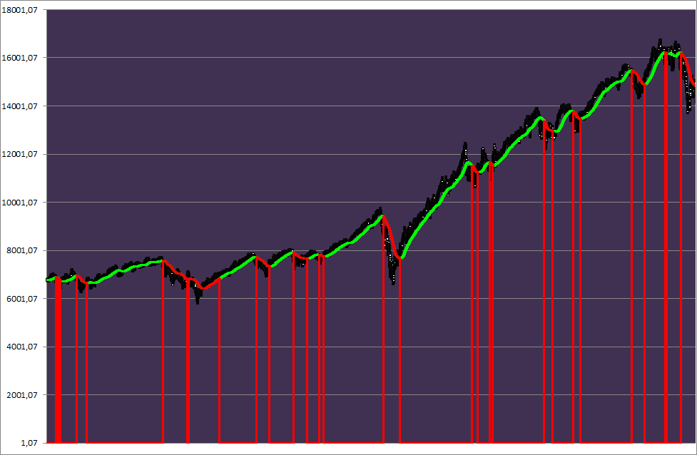 Cuando las medias de los dos timeframes estan alineadas abre operacion larga, es un metodo que se lleva utilizando hace mucho tiempo y por si mismo sin mas filtros tengo dudas de que tenga ventaja significativa porque las tendencias robustas tienen base fundamental, si obviamos esto nos quedaria una estrategia tecnica