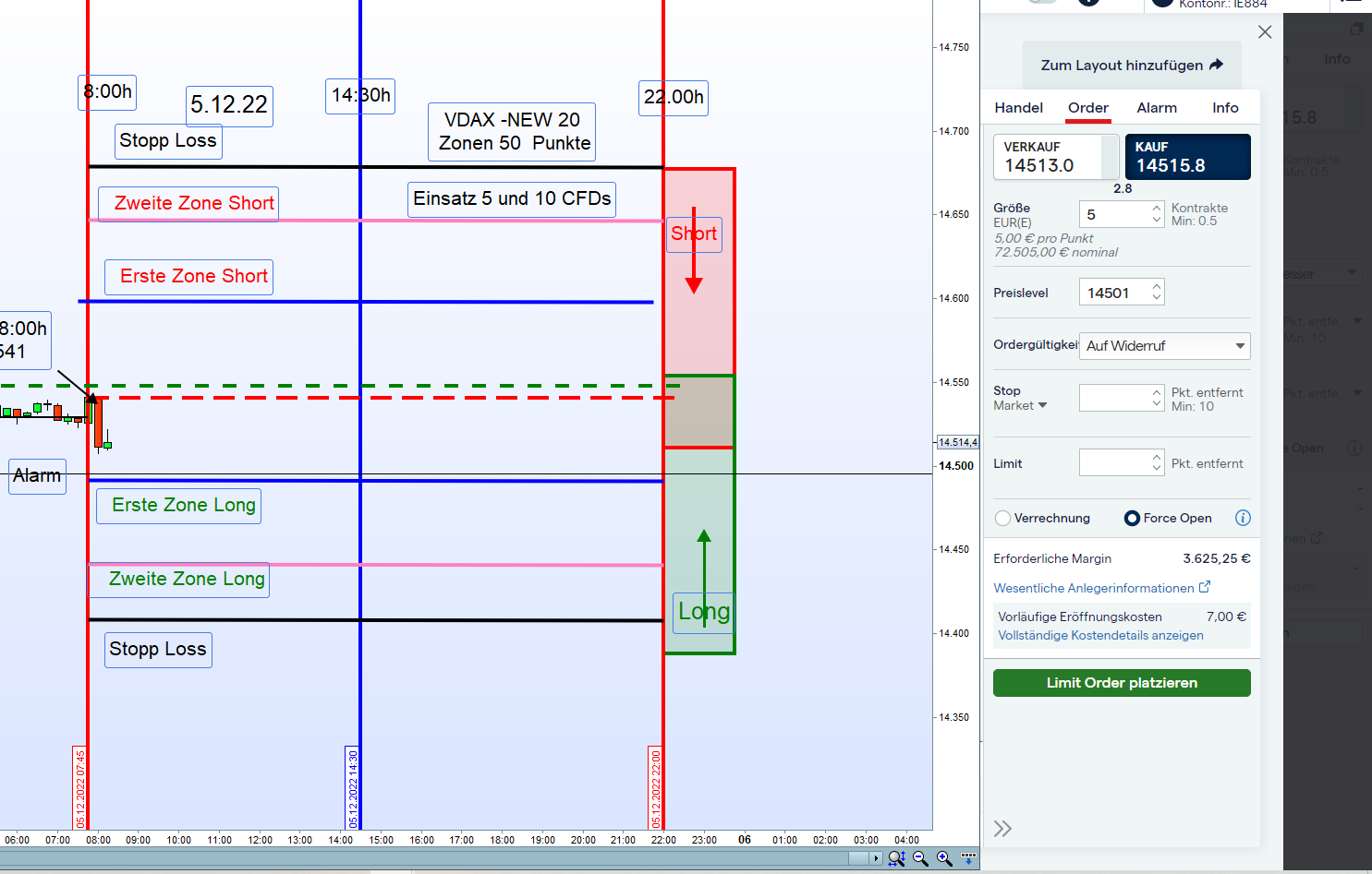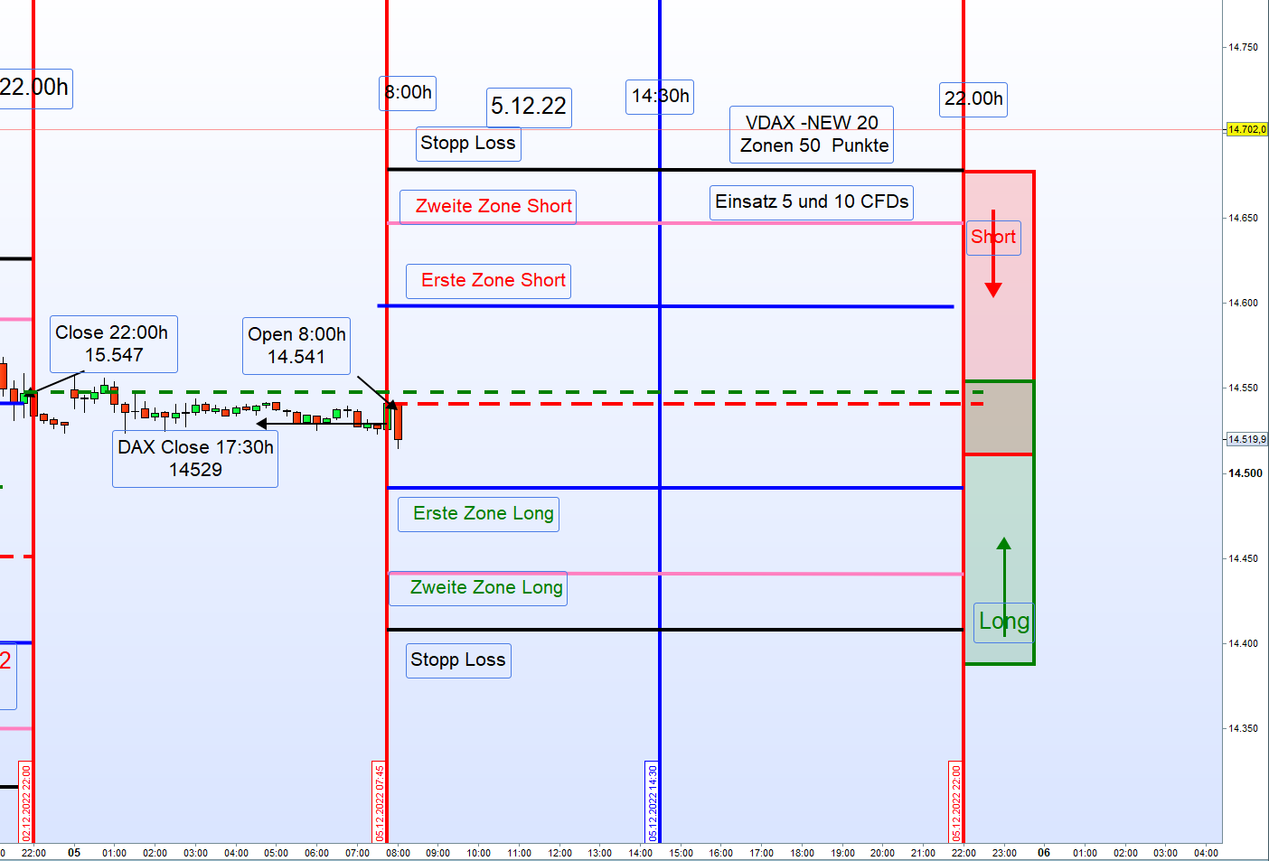 En la foto del marco operativo, he intentado emular los colores que normalmente utiliza Georg, siendo las primeras zonas de corto/largo (L1/S1) en colores azul, la segundas zonas (L2/S2) en color rosa, negros para los Stops, azul claro para el cierre del DAX de ayer y verde y rojo discontinuo para el cierre del FDAX y apertura del FDAX de hoy respectivamente. Añadir además que los datos del FDAX pueden variar ligeramente debido a vuestro broker/proveedor de datos.