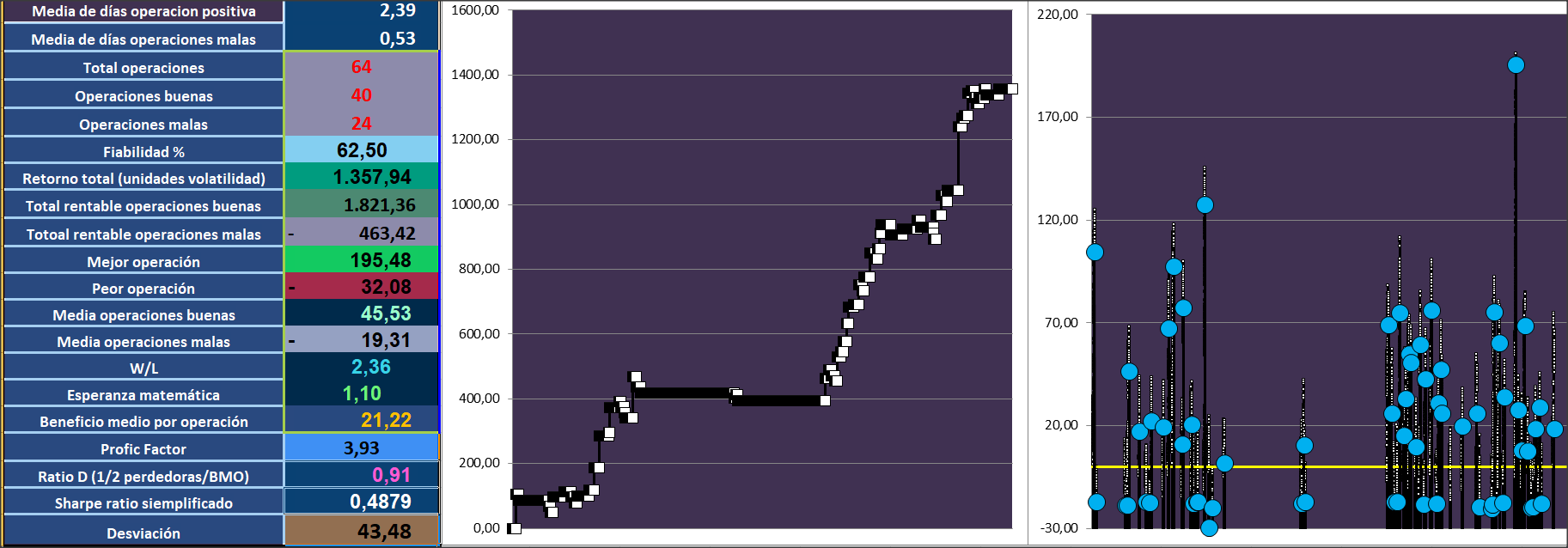 Salida trailing inteligente està salida se muestra eficiente respecto a la salida de trailing típico porque se pega mucho al precio pero sólo sale si la volatilidad excede un umbral óptimo, a favor tiene que consigue rentabilidades mucho mejores que las salidas fijas (porque va con el precio) por contra aumenta el riesgo temporal y consecuentemente baja el sharpe ratio, aunque consigue un mejor equilibrio entre un buen ratio WL y fiabilidad así como un mayor beneficio medio por operación.